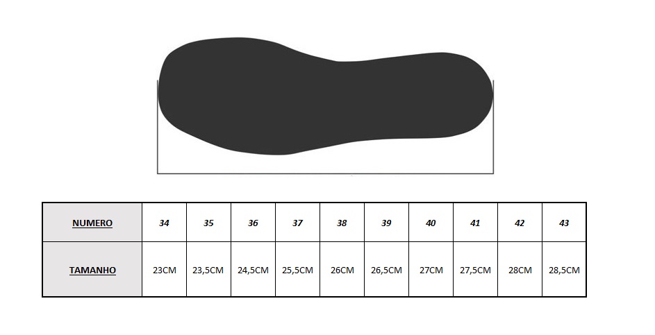 Compare a medida dos seus tênis com nossas medidas para que o produto comprado não seja no tamanho errado: